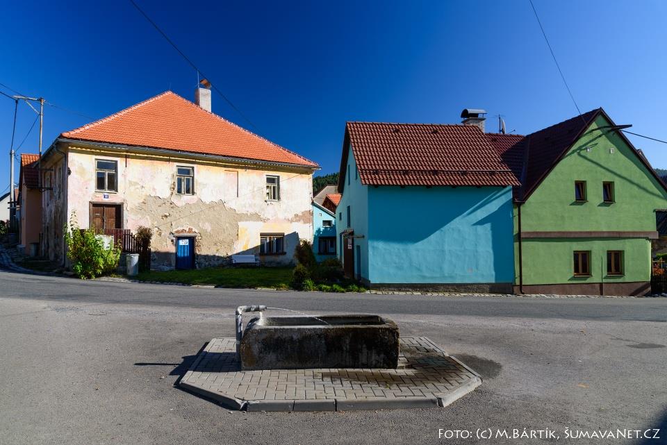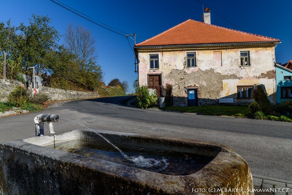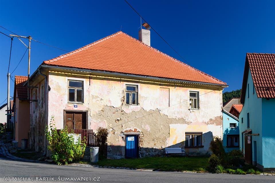 Bývalá synagoga v Podmoklech stojí po pravé straně silnice vedoucí směrem na Sušici.
