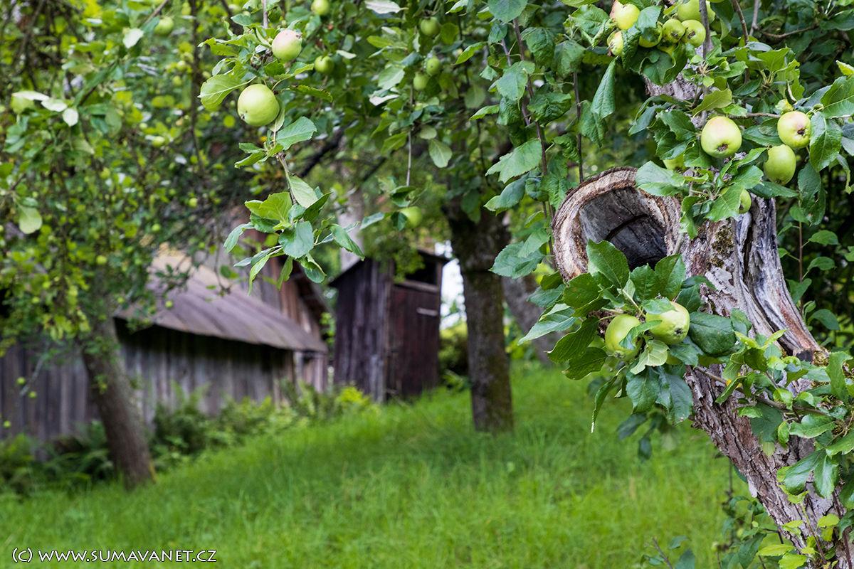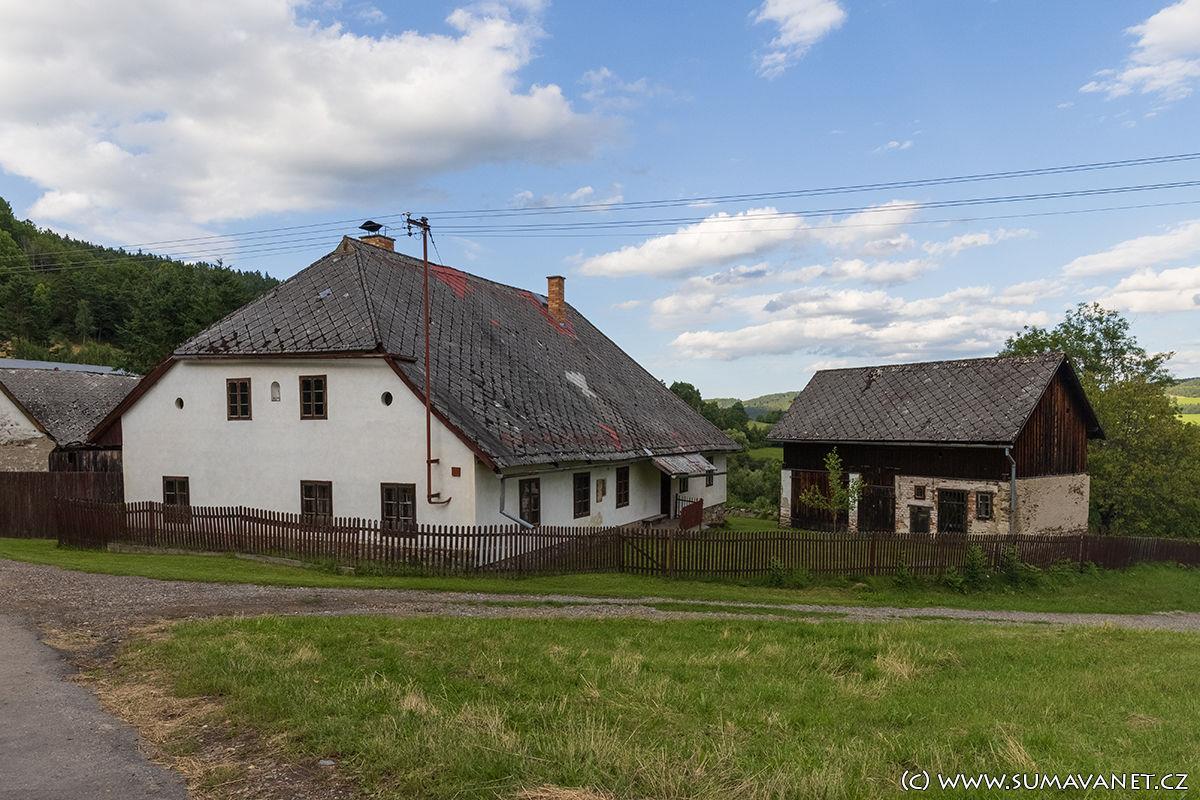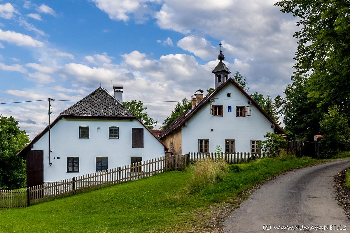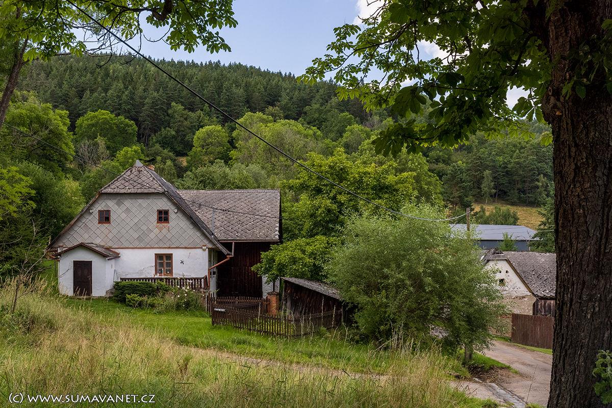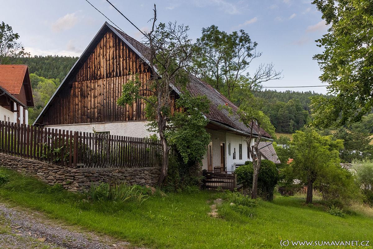Typická šumavská stavení stojí na svahu nad řekou Otavou v nadmořské výšce 570 m.